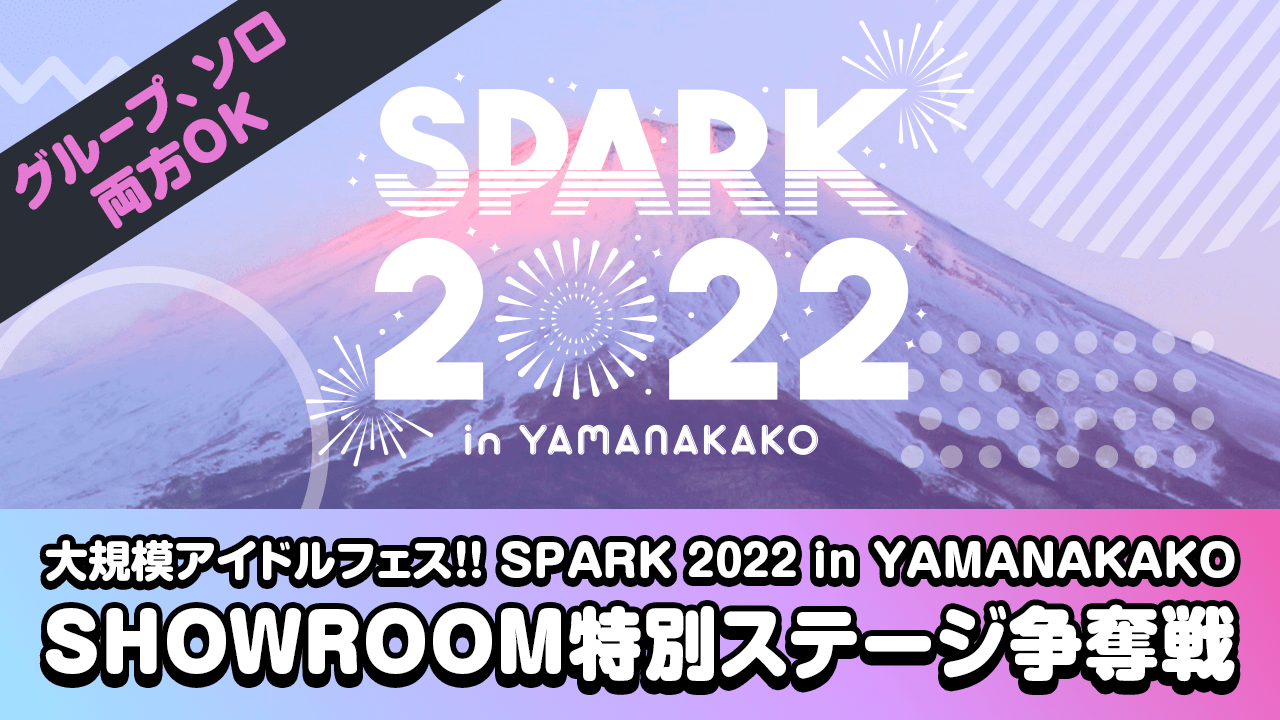 2022/7/16(土)から7/18(月・祝)まで山中湖交流プラザきららにて開催されるSPARK 2022 in YAMANAKAKOの、SHOWROOM特別ステージでのライブパフォーマンスをかけたイベントをSHOWROOM上で開催します。