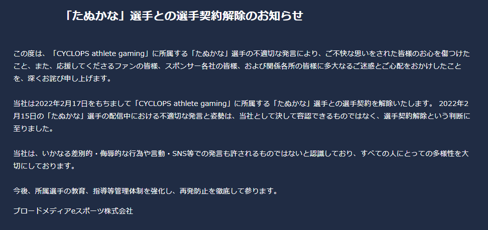 お知らせより「当社は、いかなる侮辱的・差別的な行為や言動、SNS等での発言でも許されるものではないと認識しており」とありますがコバトン氏の発言はいかに考えますか? pic.twitter.com/0QrZAMV591