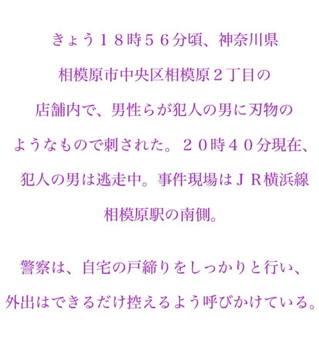 令和5年1月2日午後6時56分頃、相模原市中央区相模原2丁目所在の店舗内において、男性らが犯人の男に刃物様の物で刺される事案が発生しました。現在、犯人の男は逃走中です。#相模原市 #傷害 #刃物 #逃走#神奈川県警 #警察 #拡散希望 pic.twitter.com/1TrqMo4E8y