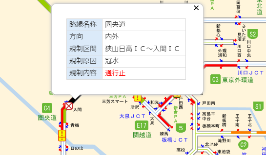 圏央道の狭山日高↔︎入間が路面冠水で通行止めとか、殆ど見たことないレア表示出してる‥‥#交通情報 pic.twitter.com/CGkcVrTtTv