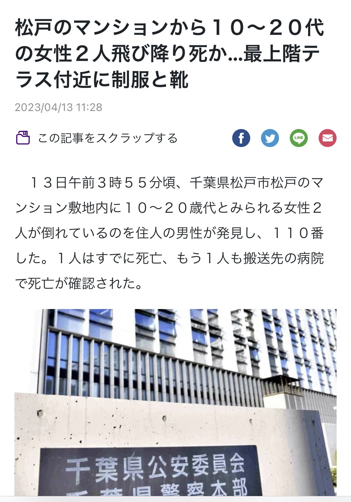 参考 松戸のマンションで飛び降り 女性2人が死亡