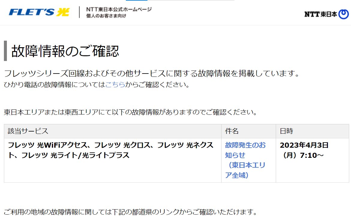 【NTT障害】NTT東日本 フレッツ光で通信障害「ドコモ光だけど急にネットに繋がらない、家のWi-Fiがお亡くなりになった」#NTT東 4月3日