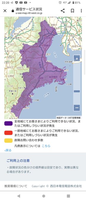公式では三重県全域で障害、名古屋の一部でも調子が悪いとの報告あり