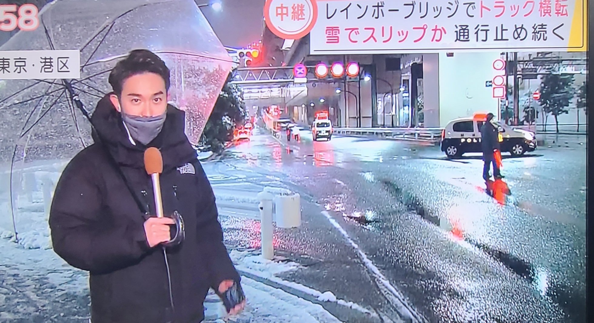 雪の影響とトラック横転でレインボーブリッジ封鎖で通行止め