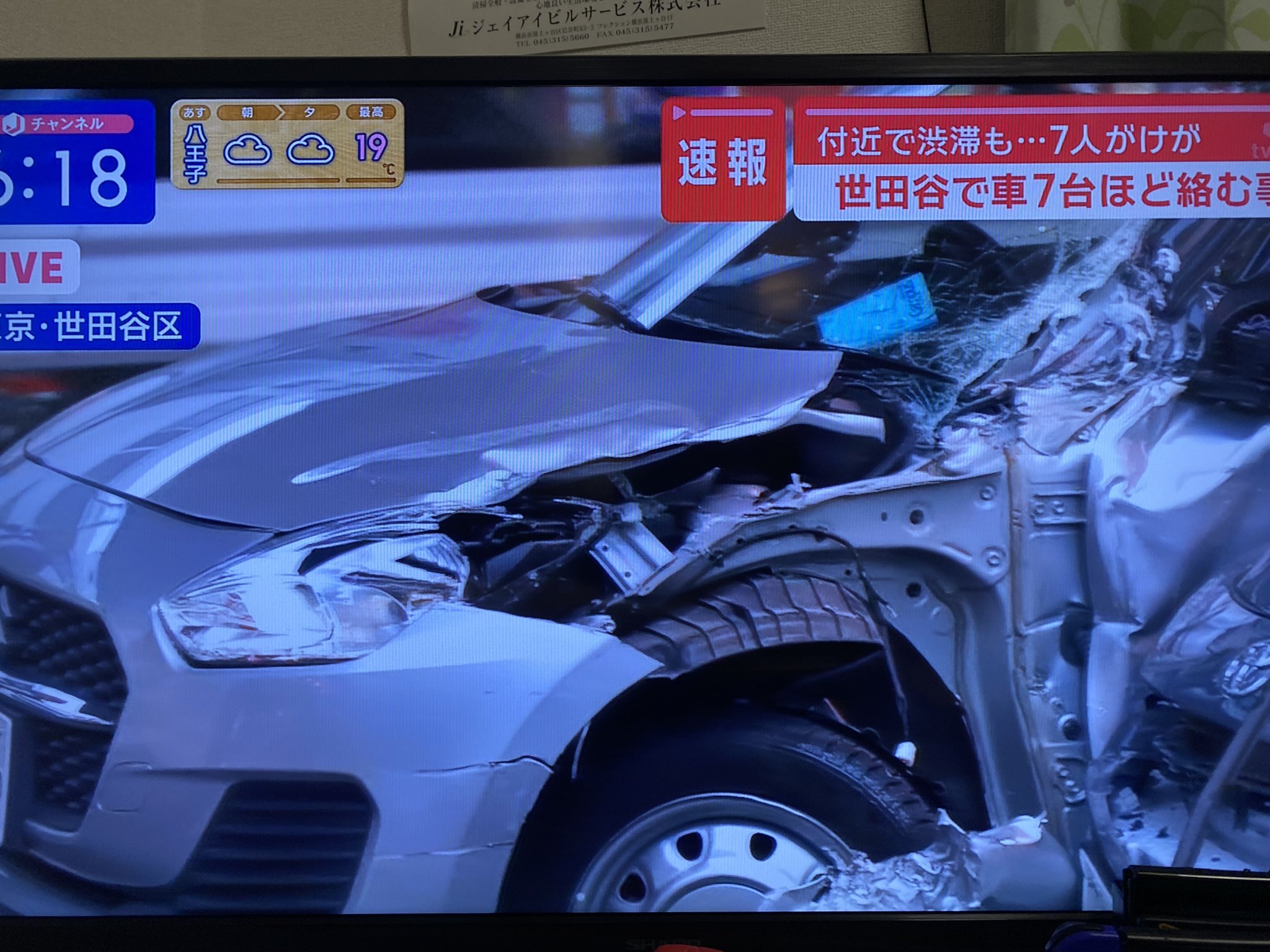 外で凄い音がしたから見に行ったら大事故だったすでに報道の方々が居たけど素早いな!