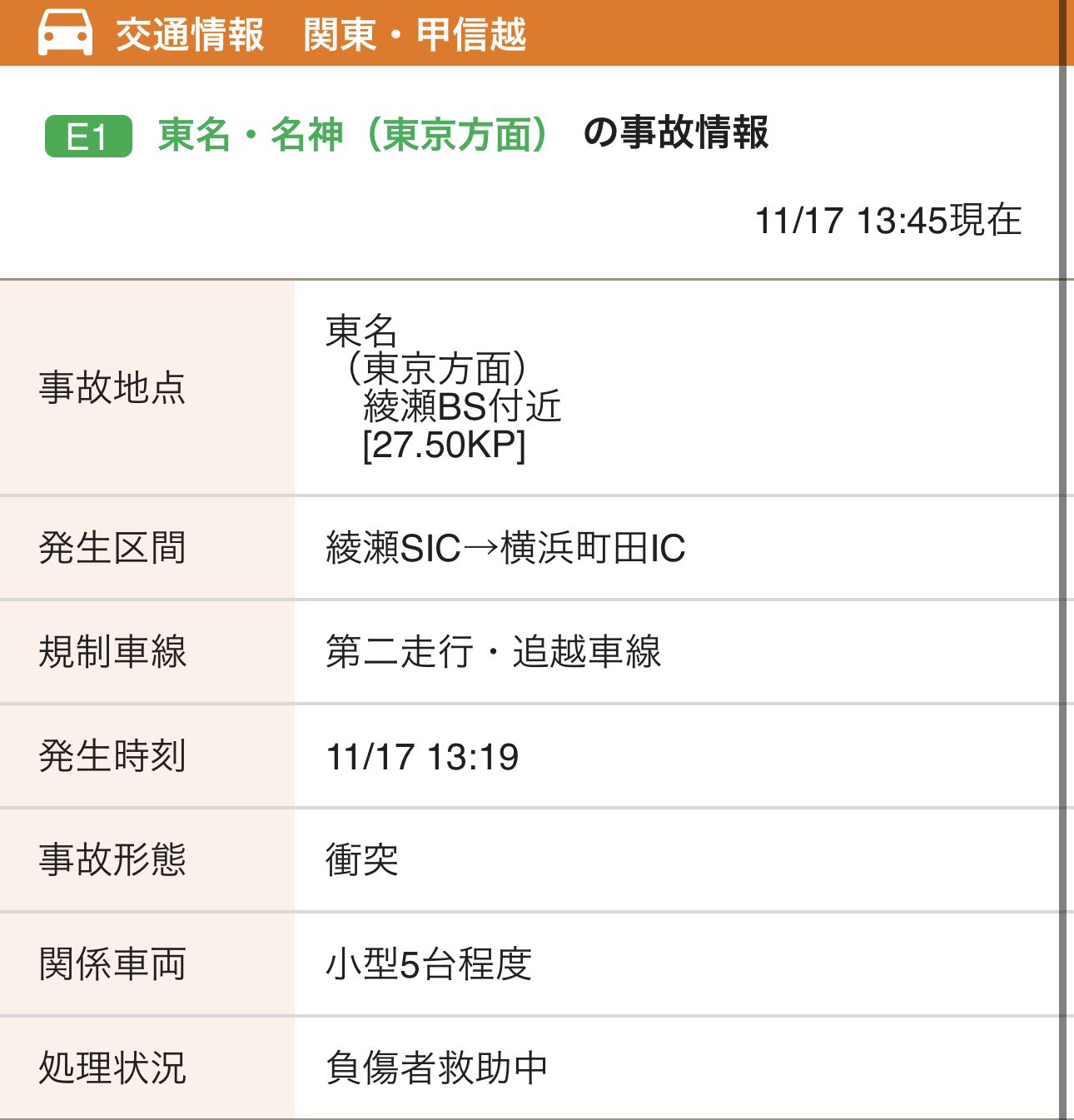 東名高速道路 綾瀬スマートIC~横浜町田IC間で乗用車やバイクなど6台が絡む衝突事故「道路にライダーが倒れてて破片が散乱、東名渋滞30km4時間以上でほとんど動いてない」「事故処理中に別の事故多発」車線規制で渋滞 #東名 11月17日