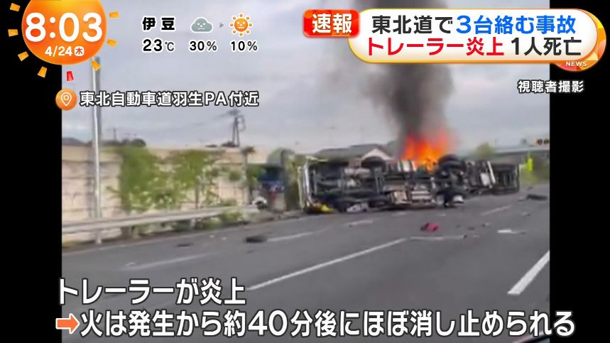 5時30分頃 東北自動車道 羽生IC~館林IC間で大型トレーラーやタンクローリーなど3台が絡む事故