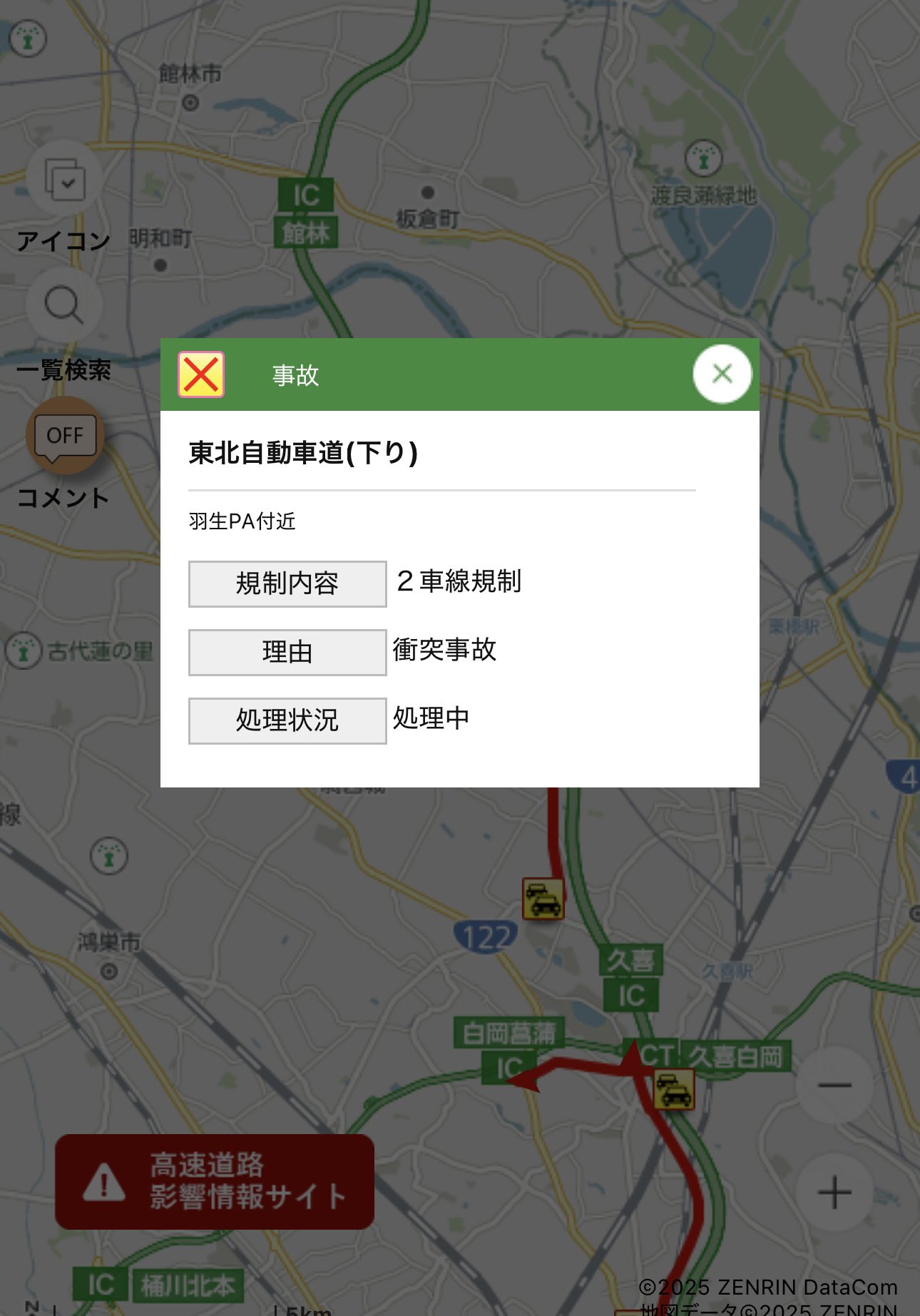 東北自動車道(羽生IC〜館林IC間)下り線にて発生した車両火災事故による通行止の影響で大迷惑。