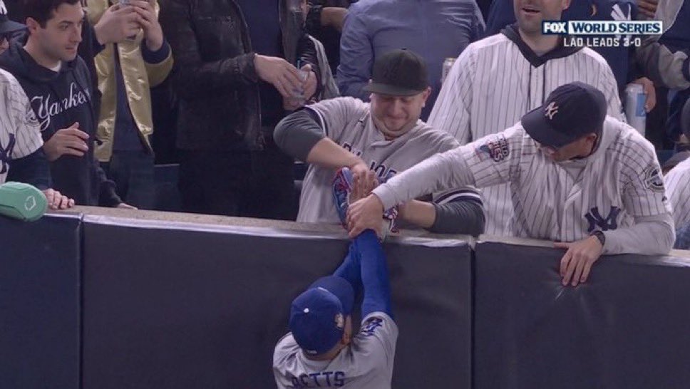 ファールキャッチしたベッツのグローブをこじ開けてボールを強奪しようとしたヤンキースファン
