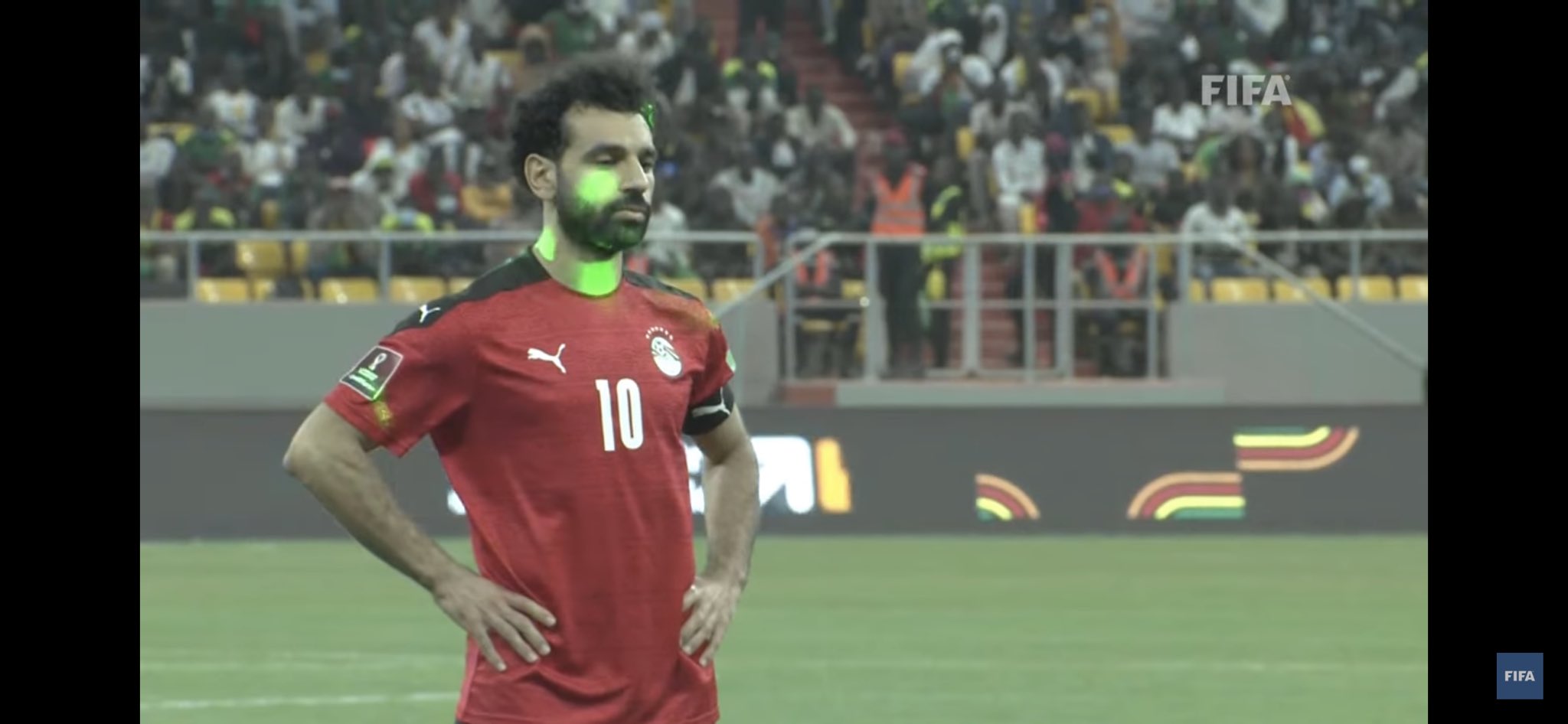 W杯アフリカ予選 セネガルサポーターがレーザーポインターで緑色の光をエジプトの選手たちに浴びせ妨害