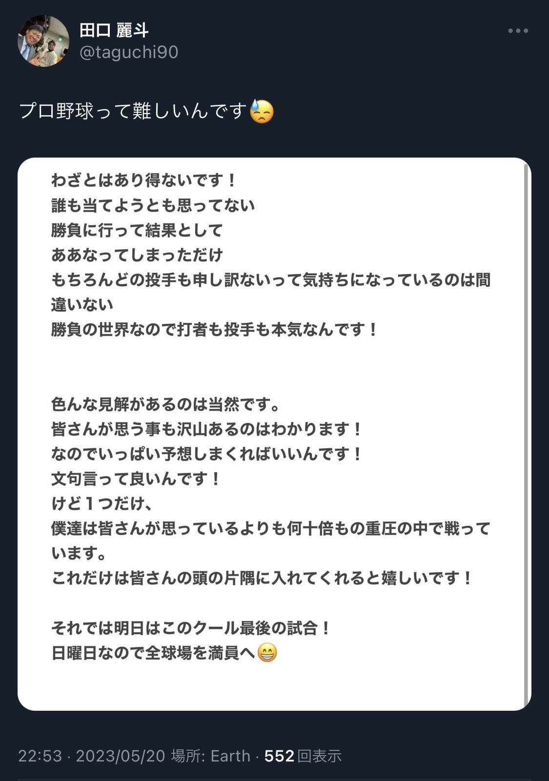 普通に誹謗中傷する人が悪いし、田口を支持はするが、しっかり誹謗中傷は情報開示請求などして、SNSの使い方は見直してほしいねー。ああいう発言はプロ野球選手なら誰しもが思ってることやろうし、気にしてはないわ。