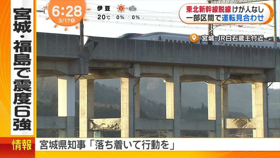 地震の影響で東北新幹線 福島駅〜白石蔵王駅間で列車脱線事故、架線柱などが破損