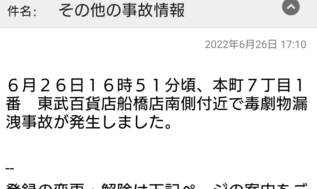 16時51分頃 総武線 船橋駅ホームに謎の液体を発見で封鎖、毒劇物漏洩事故と船橋市からメール配信