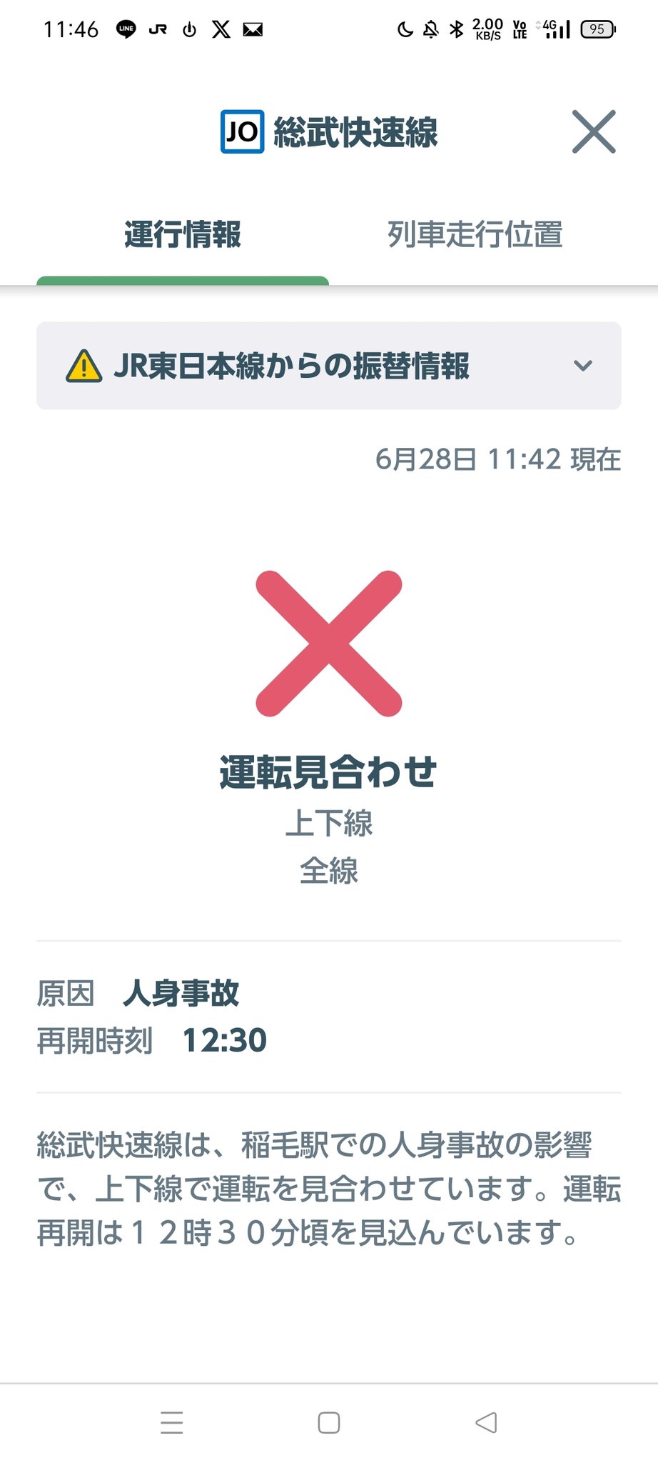 2024年6月27日 津田沼駅で人身事故、103分の運転見合わせ