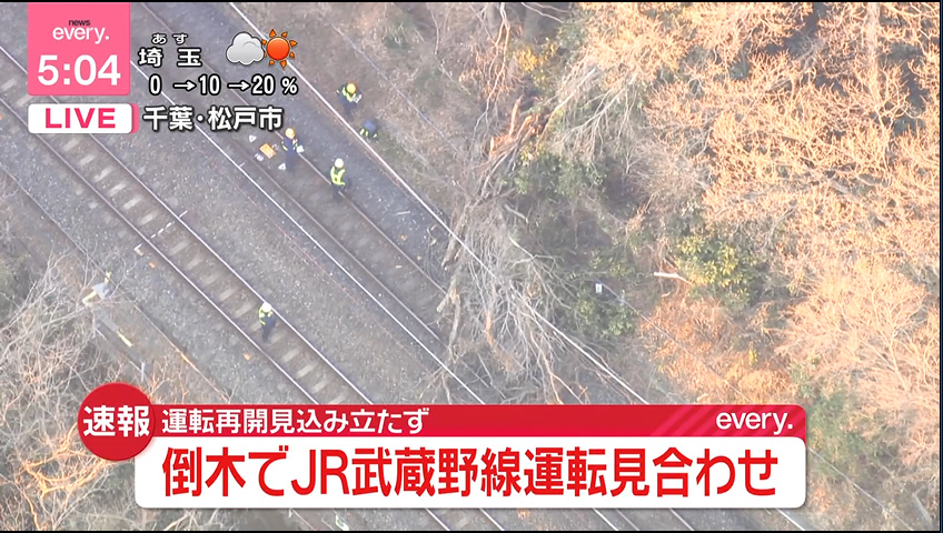 【速報】JR武蔵野線が倒木の影響で一部運転見合わせ 西船橋-吉川美南間の上下線で運転再開の見込み立たず 午後5時15分現在(TBS NEWS DIG Powered by JNN) - Yahoo!ニュース