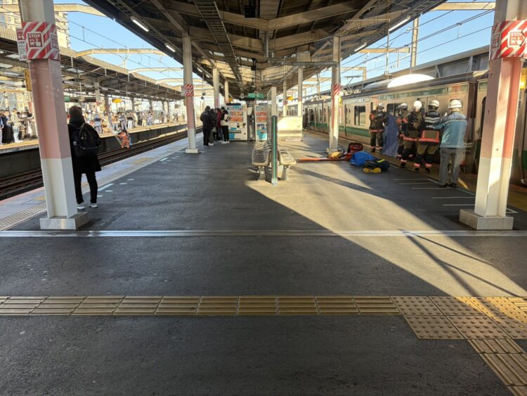 人身事故だけでなくタイムリーに眼の前で男性が線路に転落し、消防と警察で救護活動。