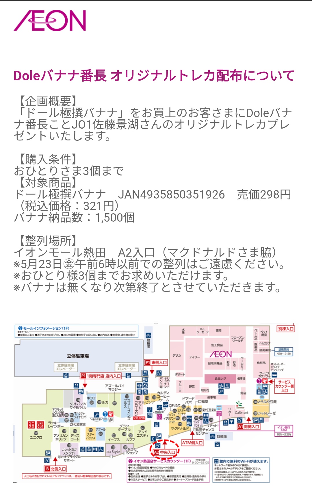 Doleバナナ番長JO1佐藤景瑚さん 熱田イオンのオリジナルトレカ配布、バナナ並び列レポ「バナナ待機列とバナナ専用レジある」「レジ袋無料と塩飴配布の神対応」